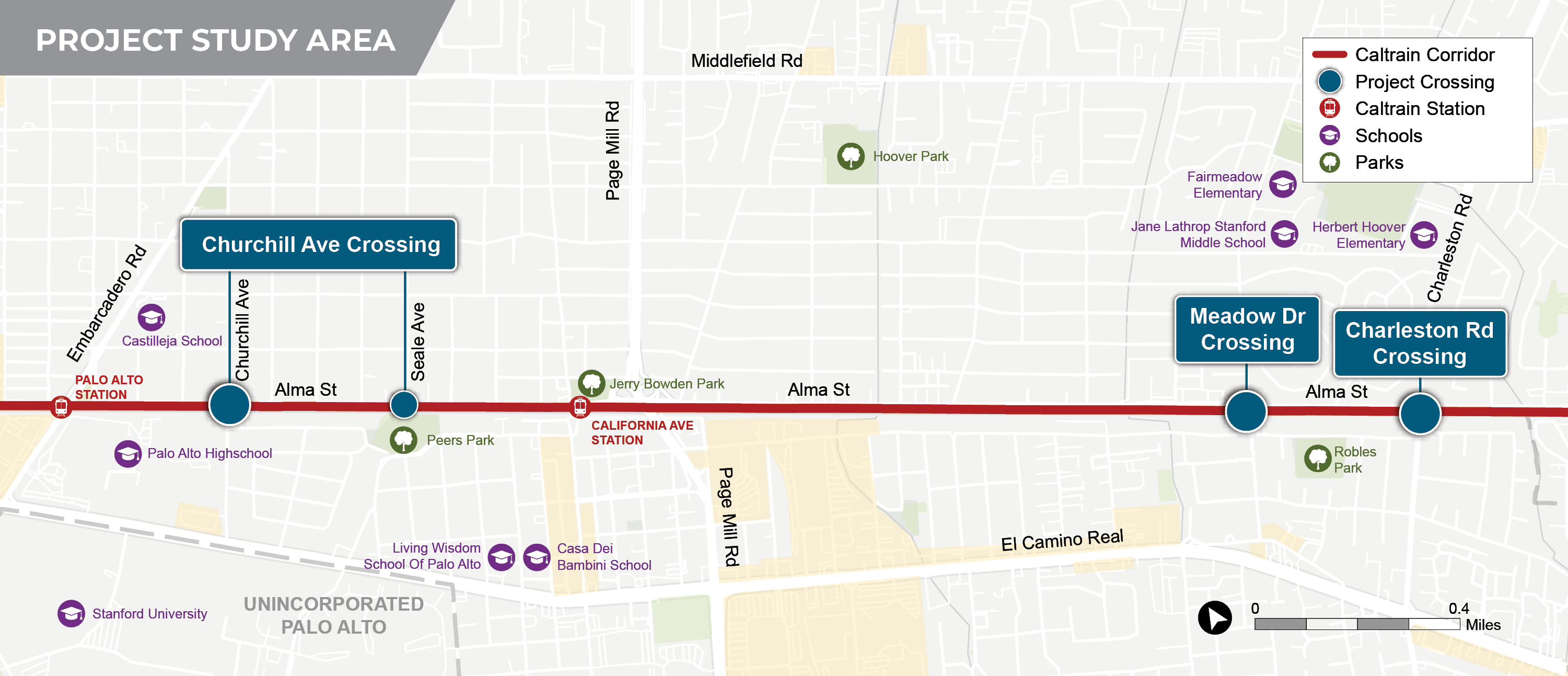 Study area map outlining the three project locations along the Caltrain corridor in Palo Alto. The study area includes the rail intersection of Churchill Avenue, Meadow Drive, and Charleston Road.